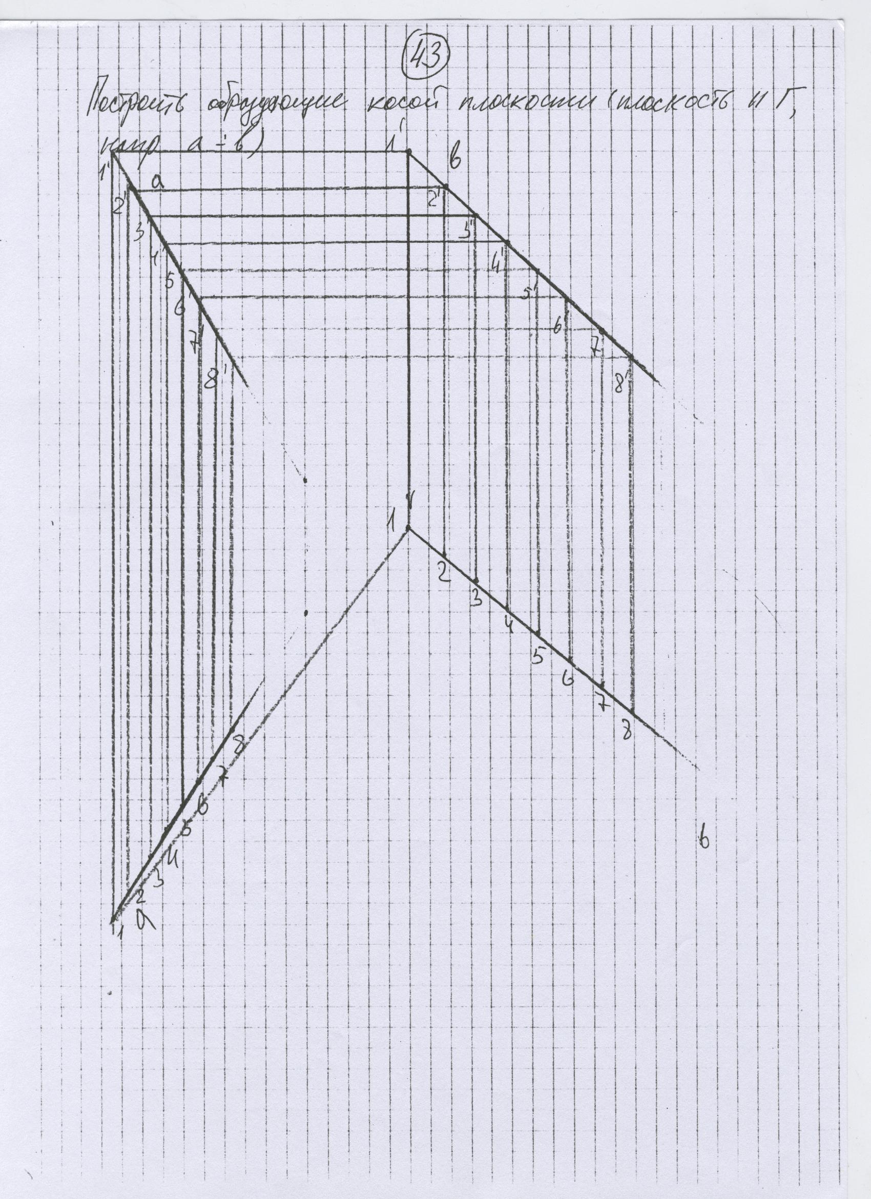 Решение задачи №43 - Начертательная геометрия. Построить образующие (10-12) косой плоскости (плоскость параллелизма - Г, направляющие a и b)
