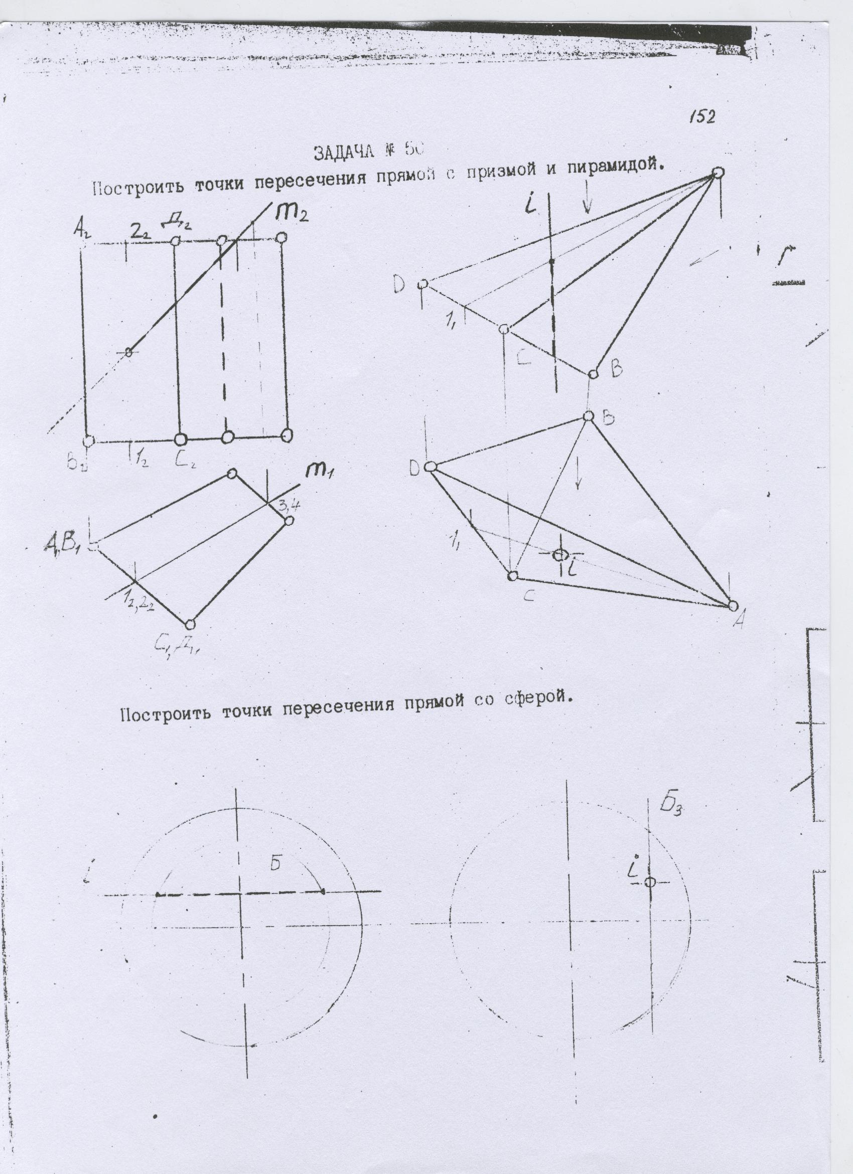Решение задачи №50 - Начертательная геометрия. Построить точки пересечения прямой с призмой и пирамидой.Построить пересечения прямой и сферы