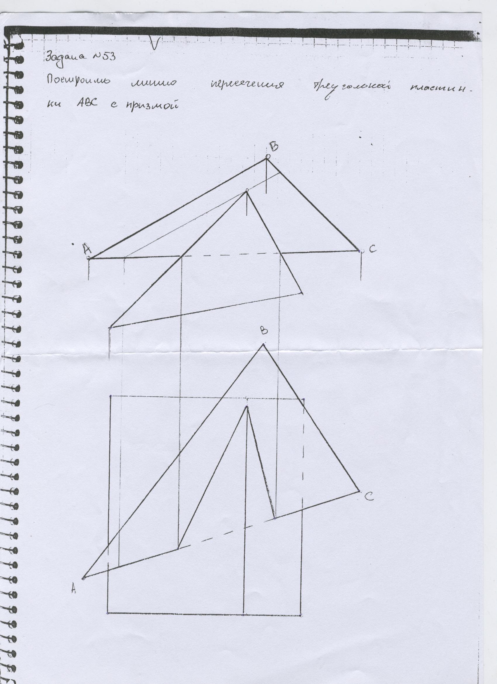 Решение задачи №53 - Начертательная геометрия. Построить линию пересечения треугольной пластинки АВС с призмой.