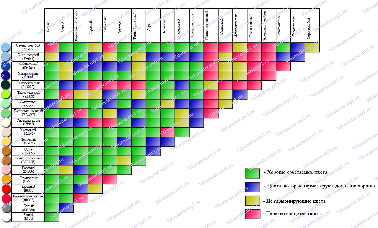 Таблица сочетаемости цветов позволяющет быстро и удобно определить гармонирующие между собой цвета. Эта таблица цветов (так же именуемая таблица совместимости цветов) сослужит хорошую службу как WEB дизайнерам так и другим дизайнерам всех видов и мастей. Еще она очень помогает при необходимости красиво оформить какую либо работу или презентацию. В таблице присутствуют образчики цветов и их кодировка, введя которую в любом графическом редакторе вы быстро обнаружите необходимый цвет.